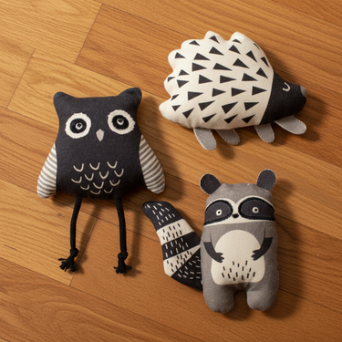 The dog toy set includes three charming characters: a mischievous raccoon, a wise owl, and an endearing hedgehog. Each toy comes in a beautiful color – black, white, and beige – adding variety to your dog's playtime and complementing beautifully your home decor and ambiance.