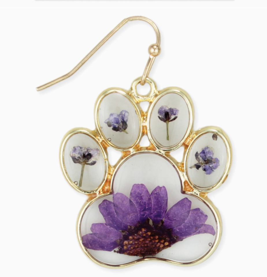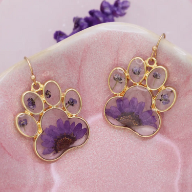 Add a touch of botanical beauty to your daily look with our Purple Dried Flower Paw Gold Earrings. These stunning dangles feature genuine purple dried flowers delicately preserved in clear acrylic, all framed within a polished gold-tone paw print silhouette. Combining a love for nature with a passion for pets, these earrings are the perfect statement piece for any animal lover.