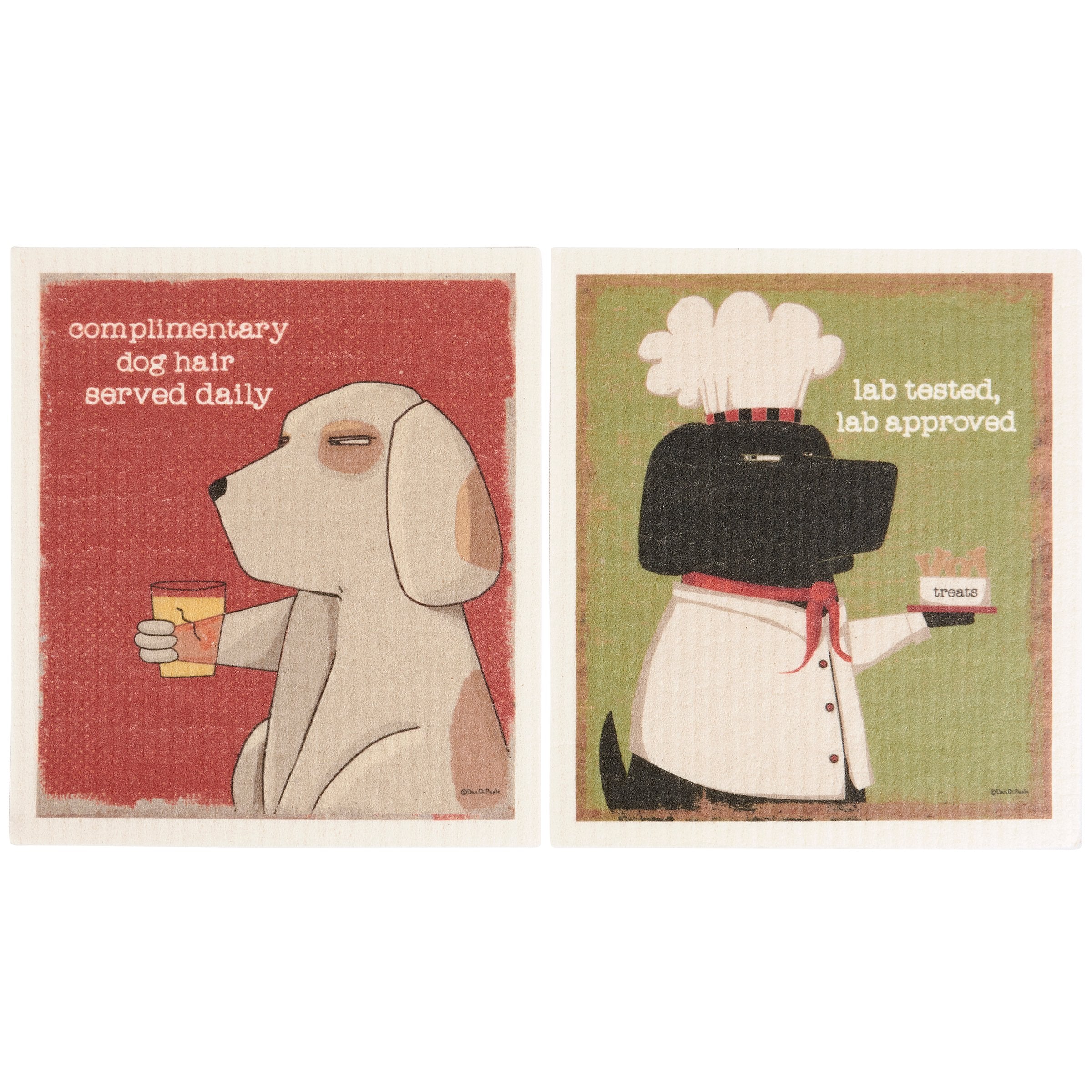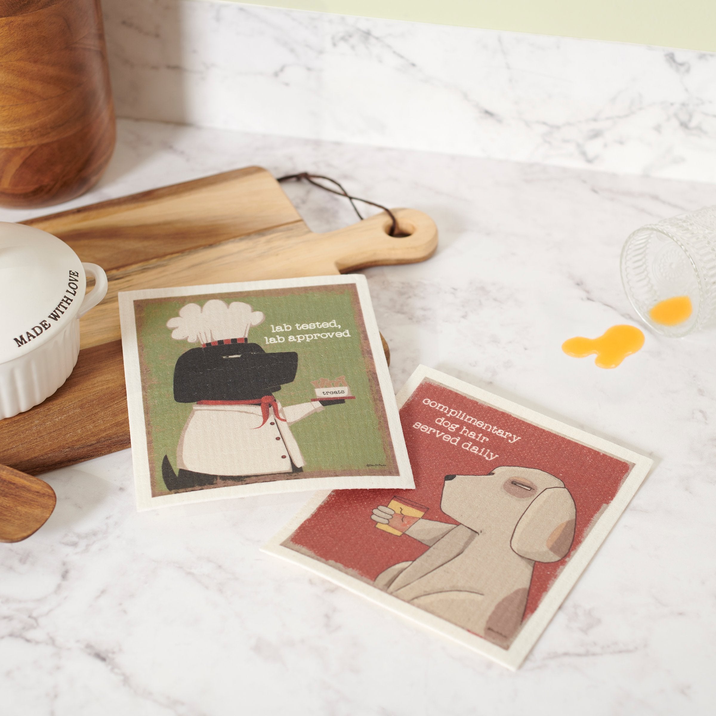 Add humor, charm, and eco-friendly practicality to your kitchen with our Complimentary Dog Hair Swedish Dishcloth Set! This adorable duo features two ultra-absorbent, reusable Swedish dishcloths with playful dog-themed artwork: