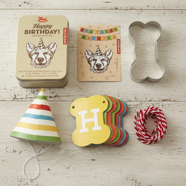 Celebrate your pooche's birthday with this fun dog birthday kit! Featuring a dog treat recipe book, a bone shaped cookie cutter, a birthday hat, banner and confetti, this dog birthday party kit has everything you need to throw the ultimutt birthday bash! It comes in a tin box, making it great for gifting, too! Whether you pick it for yourself or as a fun gift for a dog lover, it has everything you and your dog need to have a good time!