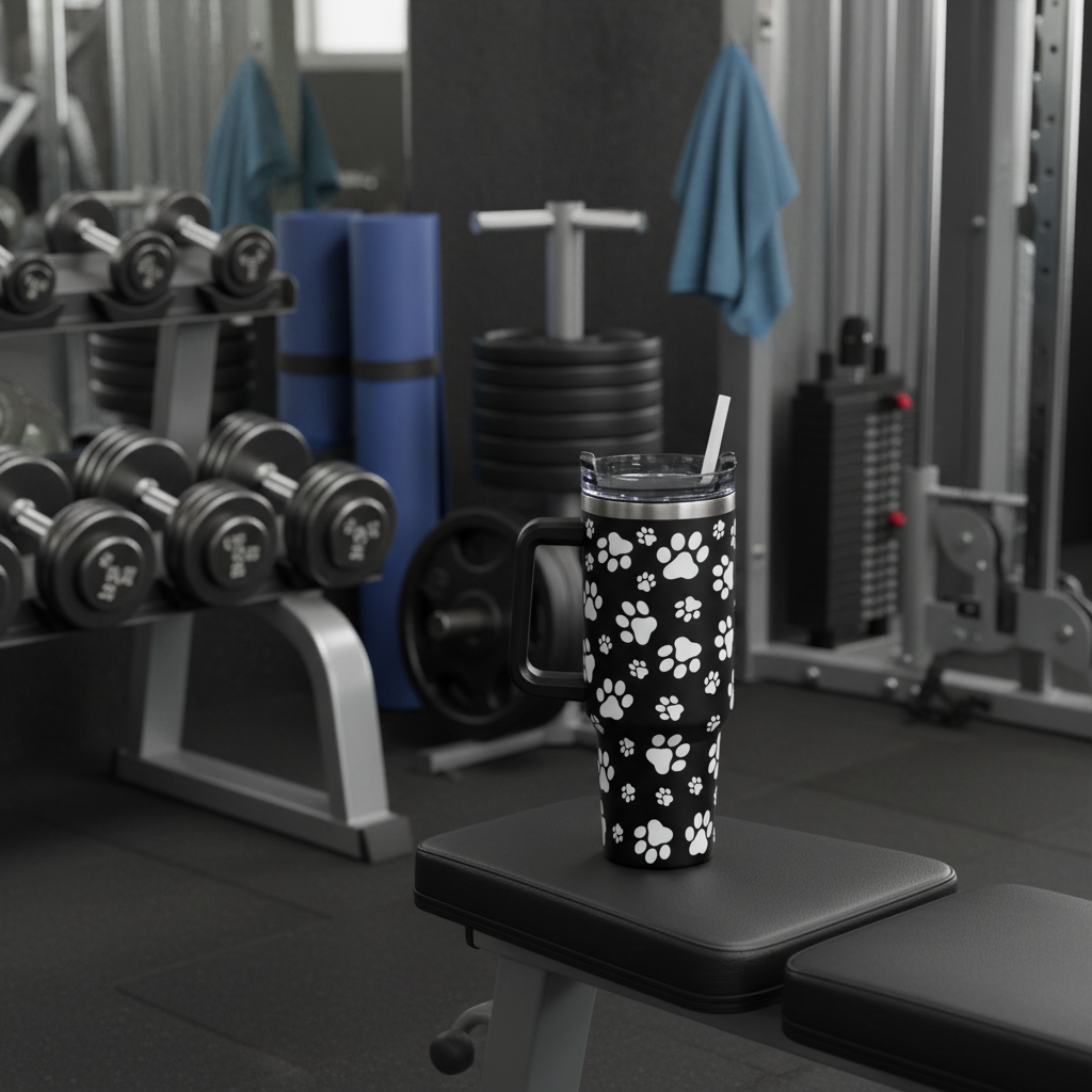 Hydrate in style with a "paws-itive" touch! This Paw Print 40oz Handle Tumbler is the ultimate companion for busy pet lovers on the go. Designed for maximum capacity and convenience, this large-volume tumbler features a sleek black finish adorned with a playful white paw print pattern. Whether you’re heading to the dog park, the office, or on a road trip, your drinks will stay at the perfect temperature for hours.
