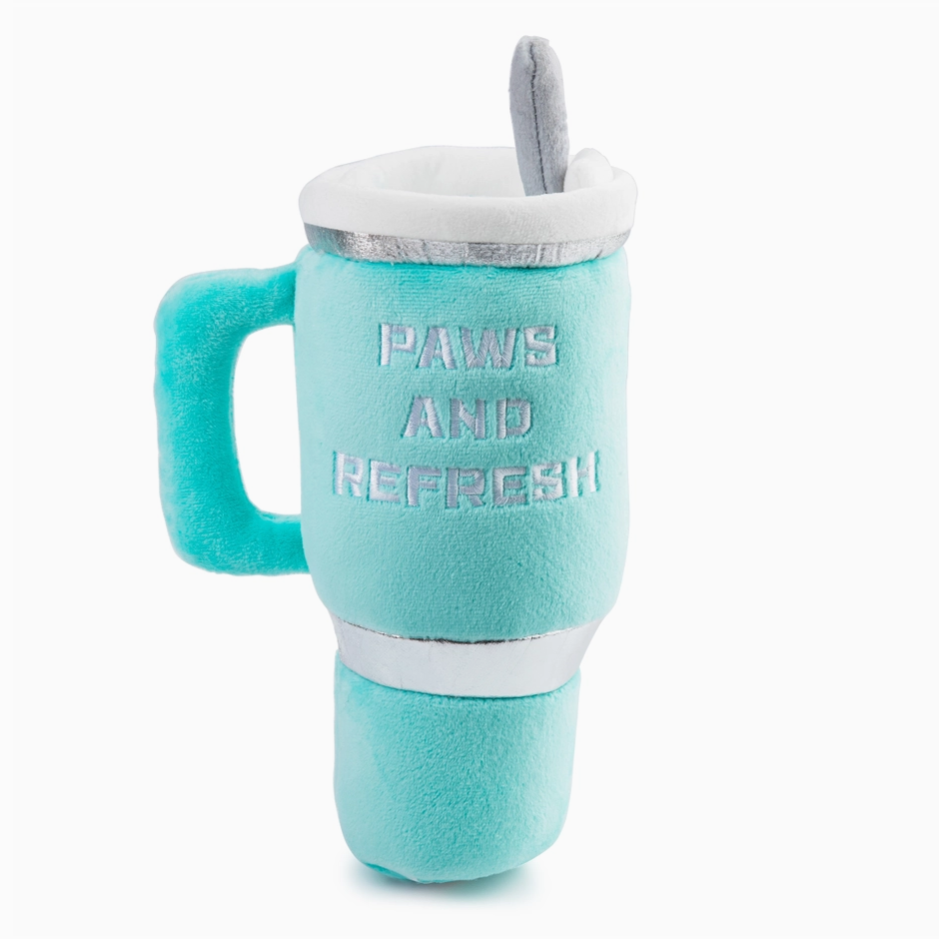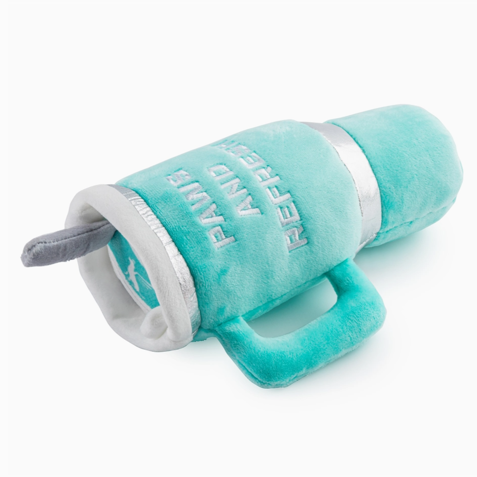 Keep your pup cool, calm, and "hydrated" with the Snuggly Cup Dog Toy! Inspired by the trendiest tumblers, this high-quality plush toy is the perfect way for your furry friend to join in on the hydration craze. Featuring a vibrant mint green exterior and stylish embroidery that reads "Paws and Refresh," it is designed to be both fun and catchy for any modern dog owner.